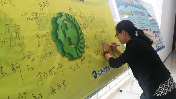 6月1日,同煤集团漳泽电力工程公司组织全员签名活动,干部员工在印有“强化安全发展观念 提升全民安全素质”的条幅上签下自己的名字,拉开了2016年安全生产月活动的序幕。