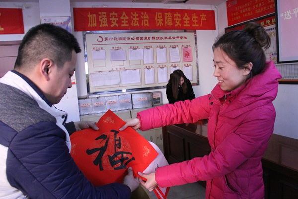 活动中,女工协管员把红红火火的福字和一幅幅春联送到一线职工手中,同时送上新年的美好祝福和安全生产的叮嘱,让广大职工在喜庆过新年的同时,把安全生产放在心头,为矿井安全生产保驾护航。