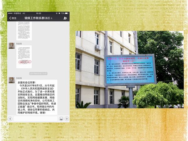 在“争做中国好网民,传递正能量”倡议活动中,陕煤化建设集团铜煤公司结合《中华人民共和国网络安全法》的施行和公司实际,在公司QQ、微信各工作平台中发出了倡议“声音”,并利用公司大屏幕等宣传渠道对倡议工作进行了广泛宣传。