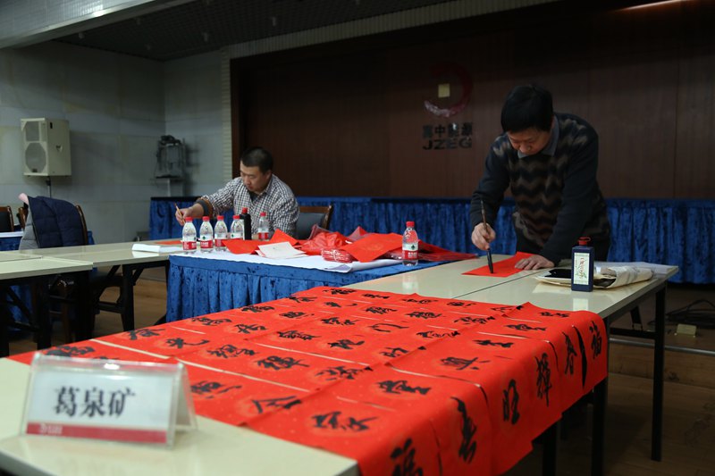 2月7日,该矿工会组织书法协会人员在四楼会议室开展了“送对联、送祝福、送平安”活动。该矿工会为职工义务写春联活动拉开了帷幕。为了更好地贴近职工,事先采购好大红纸、墨汁、金粉和毛笔等物品,组织来自车间工会的书法协会会员为职工义务写春联。