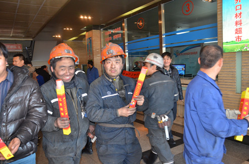 大红纸、黑墨汁,摆起桌子,挂起春联。凤凰山矿的安全文化长廊里,喜气洋洋,非常热闹。集团公司工会副主席董清、文联负责人带着集团工会领导的关心和祝福来到现场,把500余幅春联递到出井职工手中,拉开了写春联送矿工,送祝福进矿山活动大幕。一位夜班升井的老矿工黝黑的脸上露出喜悦的笑容,捧起墨迹未干的春联忘记了疲惫,爱不释手啧啧称赞:往年都是自己花钱去买春联,今天的活动,既给我们增添了春节的喜庆气氛,同时也亲眼看到了矿山书法家行云流水的书写过程,真长见识。凤矿工会主席也在现场为职工写起春联,亲自把新年祝福送到职工们心中。
