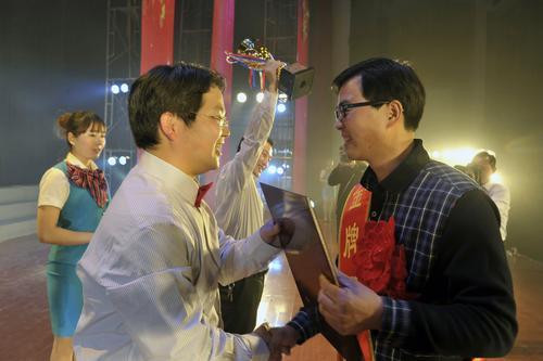图为受到表彰的金牌职工,为新春文艺汇演中获奖选手颁奖。