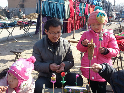 春节休假之际,山东能源新巨龙公司员工司永强带着对传统民族文化的热爱和浓浓的乡土情结,在集市上展示自己的面塑才艺,免费教儿童捏面人。图为司永强在集市上摆摊展示面塑技艺。