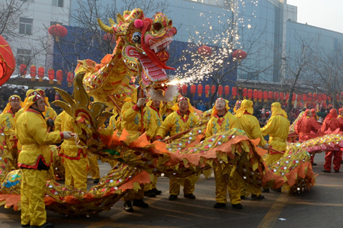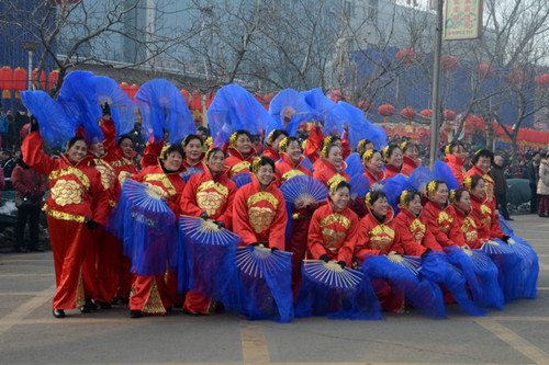 红绸彩扇,交相辉映;锣鼓唢呐,此起彼伏;一条条长龙,口喷火焰;一头头彩狮,欢腾跳跃;还有那旱船、跑驴、秧歌,各种传统民间文艺节目一一呈现,加上时尚的健美操表演和威风凛凛的武术表演,无论是表演者,还是观看者,人们喜上眉梢,乐在其中。