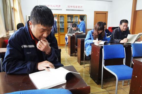 图为4月16日,该厂运销科职工在生产间歇时段,静坐于职工书屋,阅读自己喜爱的书刊。