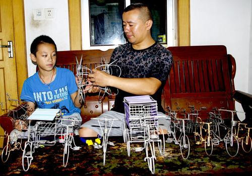 8月26日,韩万彬在向儿子传授鸟巢编织制作技术。据了解,现年38岁的韩万彬,是安徽淮北矿业集团石台矿业保运二区皮带机司机。2012年夏天去青岛旅游时,看到景区一位艺人用铁丝、铜丝在编织自行车等手工艺品,于是,回家后他后就慢慢试着练习。