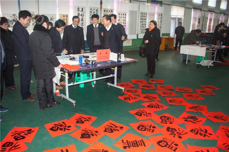 枣庄市书法名家和枣矿集团公司职工书法协会的9位书法家齐聚一堂,大家纷纷挥毫泼墨,笔下如有神,书写春联正如妙笔生花,“春暖人心世界三千同雀跃,风搏羊角云程九万共鹏飞”“国富民殷羊毫挥颂千秋业,年丰人寿燕剪裁成万点春”一副副祝福美好羊年的春联,字体迥异不同:有的苍劲有力,有的如行云流水,有的飘逸潇洒,有的庄重大气。书法家们精彩的表演让矿区职工群众大饱眼福,书法家们也将撰写的春联赠送给现场的职工群众,给矿区的新年增添了浓墨重彩的文化氛围。