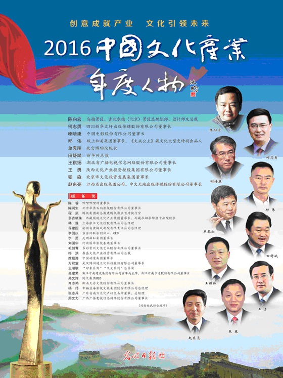 光明日报北京1月21日电(记者李慧、鲁元珍) 由光明日报社主办的“2016中国文化产业年度人物”揭晓典礼暨第五届中国文化产业主题峰会21日在京举行,10位文化产业界杰出人士荣获“2016中国文化产业年度人物”殊荣,他们是:乌镇景区、古北水镇(北京)景区总规划师及总裁陈向宏,四川新华文轩出版传媒股份有限公司董事长何志勇,中国电影股份有限公司董事长喇培康,域上和美集团董事长、《文成公主》藏文化大型史诗剧出品人邱伟,故宫博物院院长单霁翔,新华网股份有限公司董事长、总裁田舒斌,湖北省广播电视信息网络股份有限公司董事长王祺扬,陕西文化产业投资控股集团有限公司董事长王勇,北京市文化投资发展集团董事长张淼,江西省出版集团公司、中文天地出版传媒股份有限公司董事长赵东亮(按姓氏拼音排序)。此外,另有20人获得提名奖。