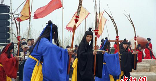 中新社山东邹城3月30日电 (沙见龙)48名孩童身着古代服饰,手执翟、籥、干、戚等不同道具,再现中国古代学子提升文化修养、强健身体的舞蹈。30日,被誉为中国“先王之乐”的完整版“六小舞”在孟子故里山东邹城首次公开亮相。