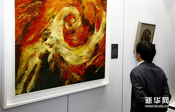 4月18日,参观者在观看一幅名为《同步辐射》的绘画作品。新华社记者 方喆 摄