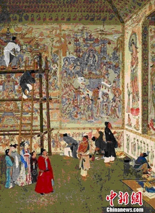 中新网兰州4月30日电 (记者 冯志军)细数举世瞩目的文化艺术宝库敦煌石窟,以及传承千年的灿烂敦煌文化,都承载着无数无名劳动者的默默付出和千年不辍的“孤守”。敦煌石窟的营造者、壁画上的劳动者、敦煌石窟的守护者,构成了敦煌壁画内外的“劳动场景”。