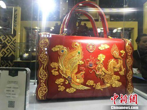 箱包中,一个以“中国红”为底色的女士手袋最为引人注目,以金线绣制了一对栩栩如生的龙凤,两端是同样以金线绣制的祥云。深圳文博会“非遗”馆刮起创新时尚风 徐晓美 摄