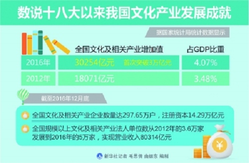 文化是民族生存和发展的重要力量。人类社会每一次跃进,人类文明每一次升华,无不伴随着文化的历史性进步。党的十八大以来,我国文化产业始终保持两位数增长,呈现出“千帆竞发、百舸争流”的良好态势。据国家统计局的统计数据,2016年,全国文化及相关产业增加值从2012年的18071亿元增加到30254亿元,首次突破3万亿元,占GDP的比重从2012年的3.48%提高到4.07%。