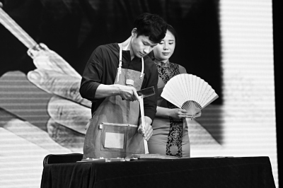 90后制扇师石国富为观众展示中国传统制扇工艺
