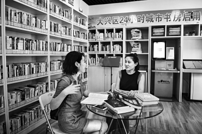 昨天下午,两位读者在刚启用的大兴区24小时城市书房里阅读交流。 本报记者 邓伟摄
