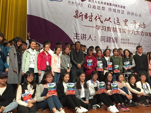 党的十九大刚刚胜利闭幕不久,何建明宣讲“新时代从这里开始”的学习贯彻落实十九大精神系列活动正式启动。11月1日晚,第一场讲座在浙江人文大讲堂湖州分会场湖州师范学院大会堂开讲,面向1500位95后大学生,何建明谈了“青春的担当”;11月2日上午,安吉余村文化礼堂,百余位安吉村干部聆听了“安吉人怎么当好先进”的演讲。