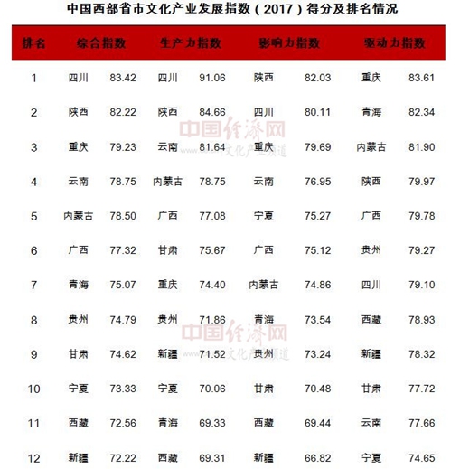 经济日报-中国经济网北京12月22日讯 12月22日,中国人民大学创意产业研究院和四川文化创意产业研究院联合发布了“中国西部省市文化产业发展指数(2017)”和“中国西部文化消费指数(2017)”。