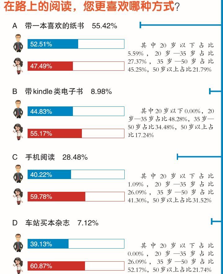 春节前后,中国新闻出版广电报微信公众号推出春节与阅读问卷调查,就是否选择让阅读陪伴旅程、是否会选择图书作为礼物等问题进行调查。调查显示,51.39%的人选择路上带本书;36.22%的人认为旅程中的阅读与平时没太大区别,21.98%的人选择在路途中进行轻松的浅阅读,17.65%的人选择在路上读开本小、轻便的图书,13.62%的人旅途中看小说等文学图书,4.34%的人读悬疑推理类图书,6.19%的人选择诗词鉴赏类篇幅短小的图书。数据同时显示,25.70%的人经常把图书作为春节礼物送亲朋,23.53%的人没有在春节期间送过图书但表示可以尝试。分析调查数据我们认为,经过10余年的阅读推广,全民阅读已经较大范围地融入百姓生活,与此同时,阅读呈现出个性化、多样化特点,阅读推广、图书推荐都存在较大空间。