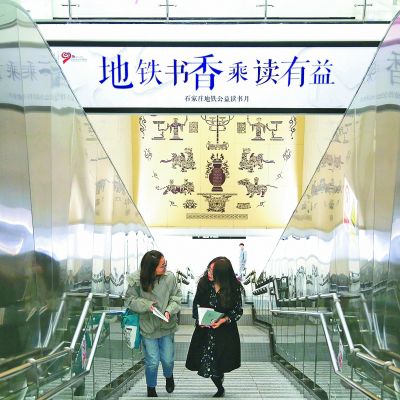 4月22日,河北石家庄首届“地铁书香 乘读有益”读书日公益活动启动。在石家庄地铁博物院站,乘客手拿免费发放的书籍在交流。照片均为新华社发