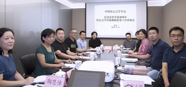 2018年7月27日,中国传记文学学会在北京召开“纪念改革开放四十周年传记文学出版数据征集工作”座谈会。人民出版社、人民出版社图典分社、作家出版 社、团结出版社、生活·读书·新知三联书店、中国书籍出版社、山东人民出版社北京分社等部分出版社的代表,以及中国传记文学学会相关负责人等出席会议。