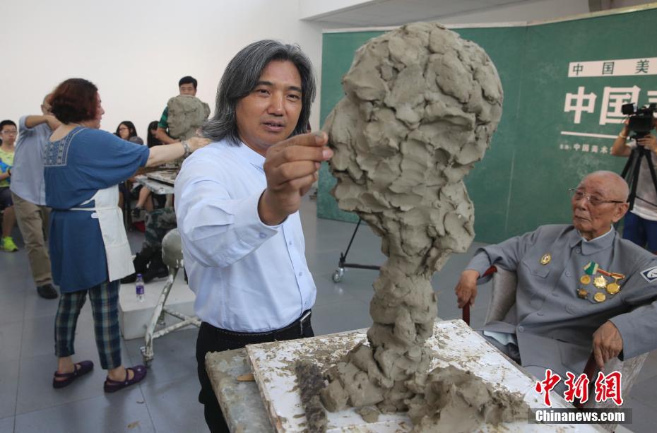 7月31日,为庆祝“八一”建军节,通过艺术创作和艺术教育的方式开展国防教育,中国美术馆在中国美术馆艺术教育空间举行“中国美术馆为军人塑 像”雕塑工作坊活动。图为全国政协常委、中国美术馆馆长、著名雕塑家吴为山现场给曾经参加过百团大战的抗战老兵、原北京军区工程兵装备器材部副政治委员、 94岁的李裕厚老人调整塑像。