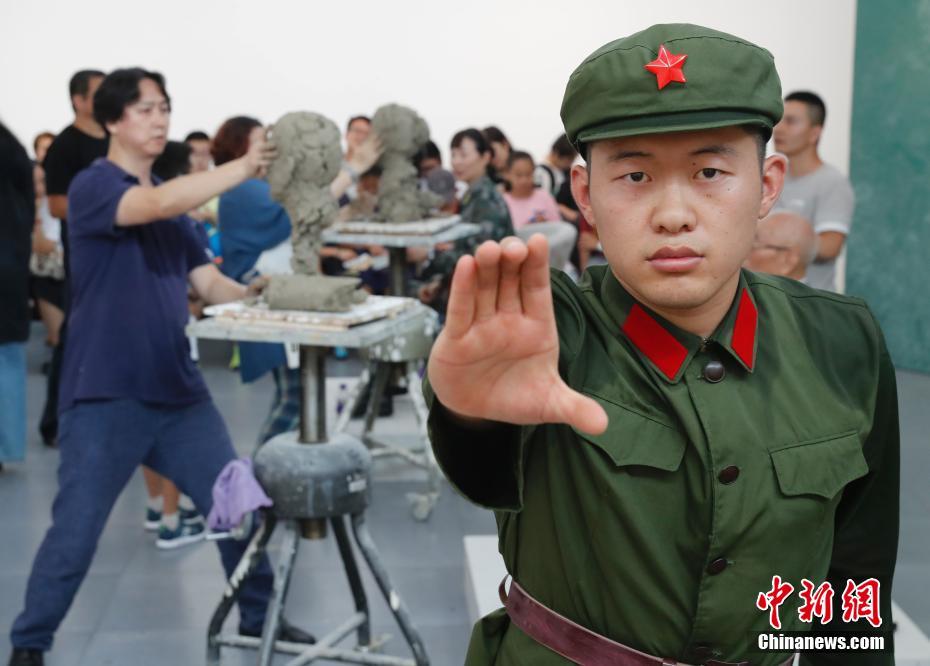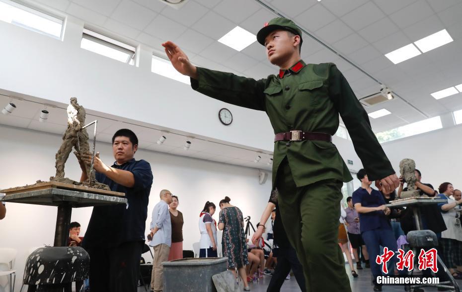 7月31日,为庆祝“八一”建军节,通过艺术创作和艺术教育的方式开展国防教育,中国美术馆在中国美术馆艺术教育空间举行“中国美术馆为军人塑 像”雕塑工作坊活动。图为现场执勤的第九支队机动三中队中士薄纯成身着李登贵当年的老军装现场担任模特,配合雕塑家创作。1976年4月29日下午,在拦 截反革命分子携带已点燃的爆炸药品,妄图闯入前苏联使馆,制造重大涉外事件的斗争中,李登贵同志临危不惧,英勇果敢,壮烈牺牲,年仅23岁。李登贵烈士被 北京军区授予“英勇无畏的警卫战士”光荣称号。