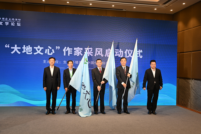 生态环境部副部长翟青、中国作家协会书记处书记邱华栋向“大地文心”生态文学作家采风团授旗