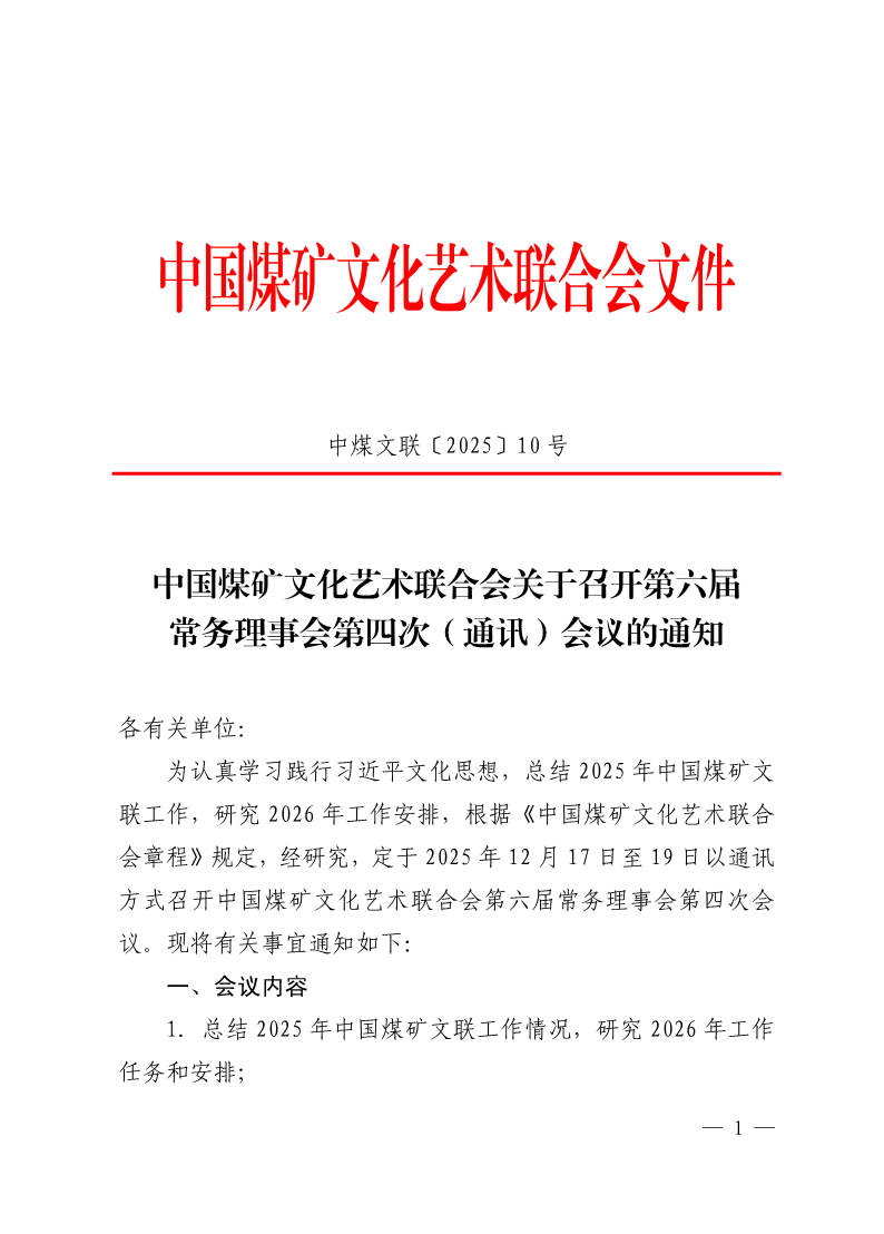 中国煤矿文化艺术联合会关于召开第六届常务理事会第四次(通讯)会议的通知 来源:中国煤矿文联 作者: 时间:2025-12-12 【字体:小 大】 附件3:中国煤矿文化艺术联合会第六届常务理事会第四次会议审议表▲ 点击或扫码在线反馈审议表 分享到: 【打印正文】