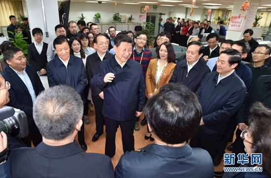 2月19日,中共中央总书记、国家主席、中央军委主席习近平在北京主持召开党的新闻舆论工作座谈会,并到中央新闻单位调研。这是习近平在新华社国内部同刚从河北正定县“走基层”回来的记者交谈。新华社记者 黄敬文 摄