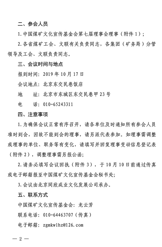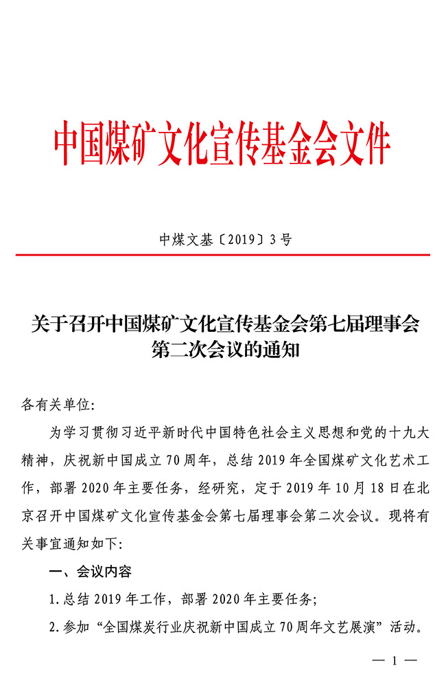 关于召开中国煤矿文化宣传基金会第七届理事会第二次会议的通知 来源:中国煤矿文化宣传基金会 作者: 时间:2019-09-30 【字体:小 大】 附件:关于召开中国煤矿文化宣传基金会第七届理事会第二次会议的通知(PDF版)1.中国煤矿文化宣传基金会第七届理事会理事名单2.中国煤矿文化宣传基金会理事变动信息登记表3.会议回执 智能标签: 中国煤矿文化宣传基金会 相关内容 分享到: 【打印正文】