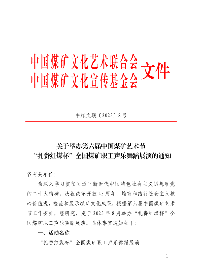 关于举办第六届中国煤矿艺术节“扎赉红煤杯”全国煤矿职工声乐舞蹈展演的通知 来源:中国煤矿文联 作者: 时间:2023-06-08 【字体:小 大】 附件:1.“扎赉红煤杯”全国煤矿职工声乐舞蹈展演声乐作品登记表2.“扎赉红煤杯”全国煤矿职工声乐舞蹈展演舞蹈作品登记表 分享到: 【打印正文】