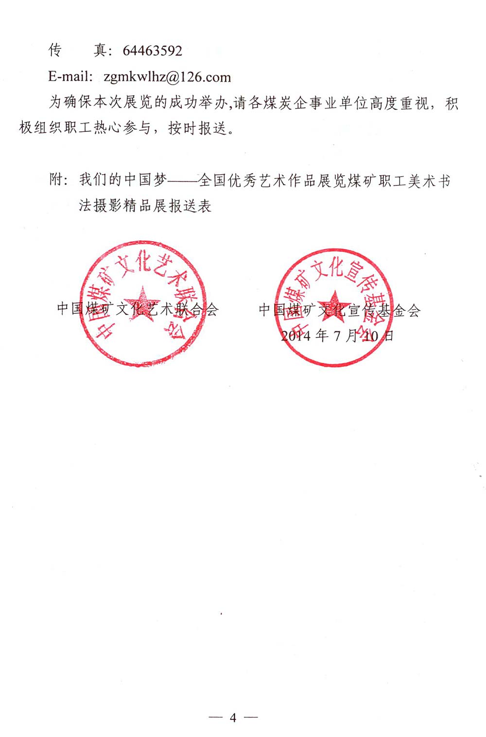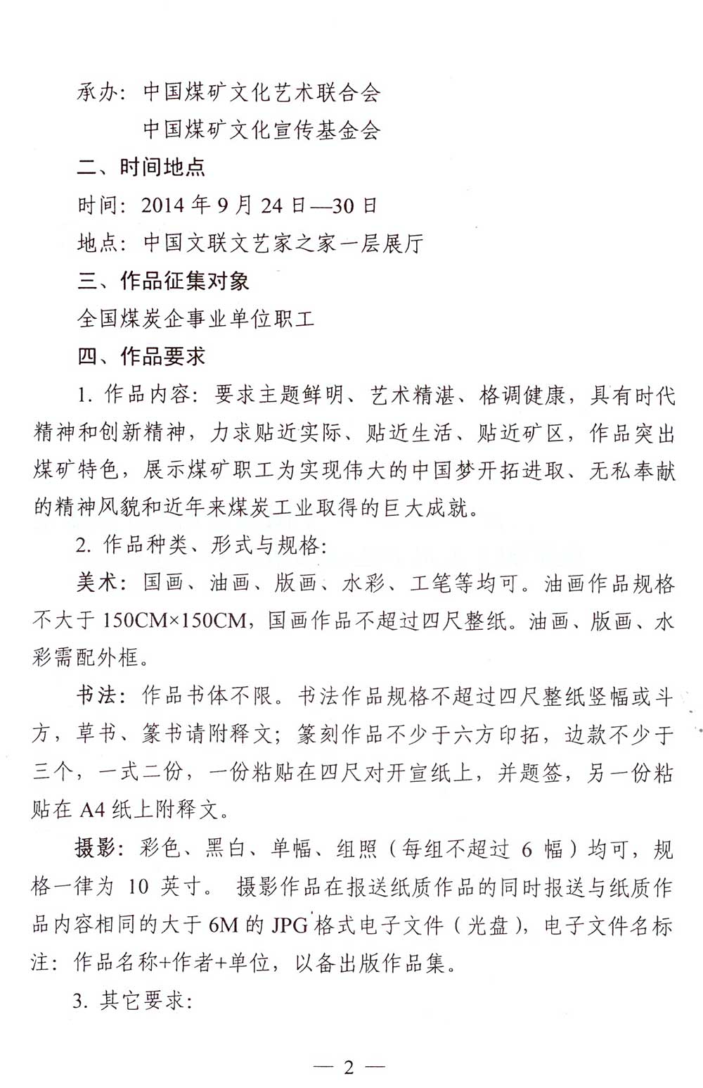 关于举办我们的中国梦——全国优秀艺术作品展览煤矿职工美术书法摄影精品展的通知 来源:中国煤矿文联 作者: 时间:2014-07-15 【字体:小 大】 附:我们的中国梦全国优秀艺术作品展览煤矿职工美术书法摄影精品展报送表 分享到: 【打印正文】