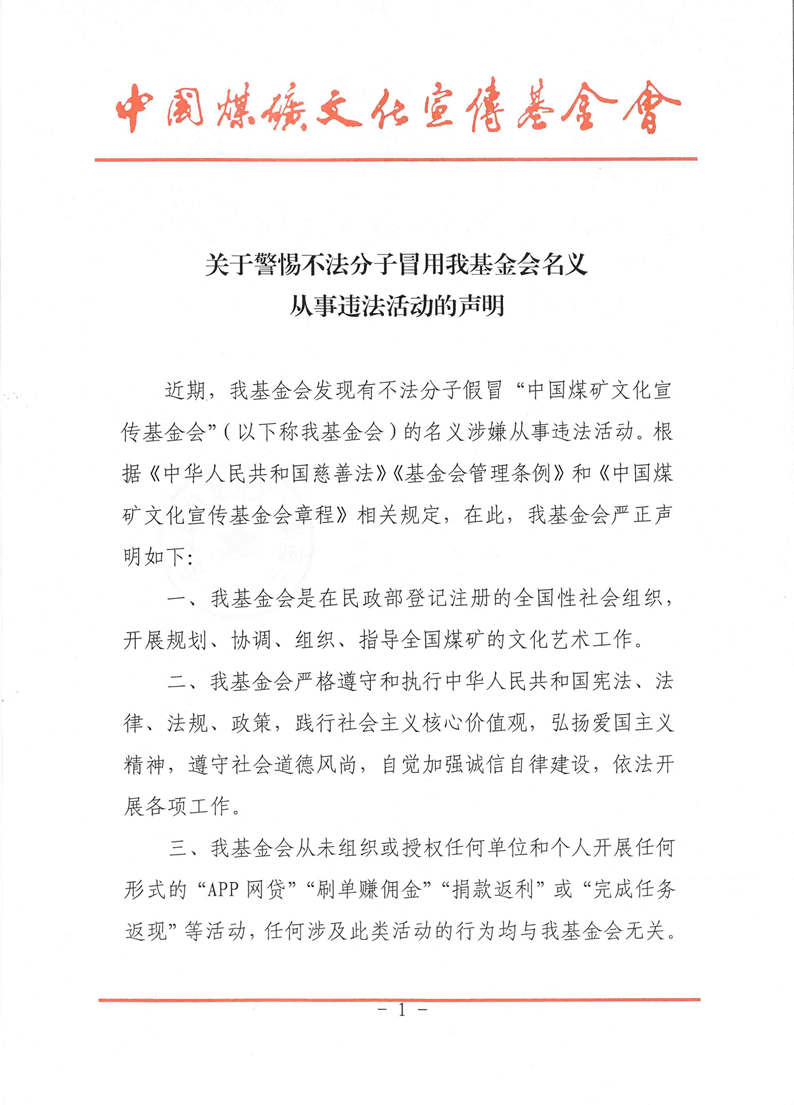 近期,我基金会发现有不法分子假冒“中国煤矿文化宣传基金会”(以下称我基金会)的名义涉嫌从事违法活动。根据《中华人民共和国慈善法》《基金会管理条例》和《中国煤矿文化宣传基金会章程》相关规定,在此,我基金会严正声明如下: