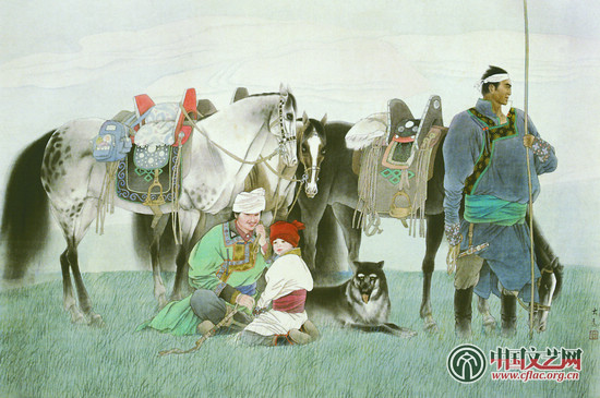 考进中央美院乃至后来定居北京,时间越久,对草原牧民的生活也越发怀念——辽阔的草原,袅袅的炊烟,空气中不时飘荡而来的夹杂着牛羊粪味的草的清香,都成为一种乡愁,引发我的怀远之情。的确,蒙古族人民质朴、热情、豪放、浪漫的性格,以及他们的风俗习惯和丰富多彩的民族传统节日,都深深地印在我的脑海里,这成为我不断创作出描绘草原牧民生活作品的情感与素材资源,工笔画《布里亚特婚礼》《雏鹰》《幼师》《学射》《漠上》《草原上的歌》和《马背上的民族》以及水墨写意画《悠悠牧歌》《草原雏鹰》等一大批作品,就是在这种情形下产生的。这些充满生活情趣的创作,其实都得益于从生活中带来的感受,是草原生活提供了这些创作最真实、最直接的素材。