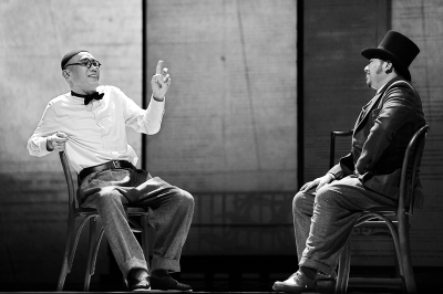 舞台采用节奏明快的碎片化的表演形式,以英文报纸为一个时光载体,把历史和今天、讲述和新闻、风情和世相通过报纸阅读的衔接精妙转换。同时,《二马》也从服装造型上打造出了兼具英伦时尚与“京味儿”互文的造型。开放性的结尾尤其干净大气意犹未尽,深藏当代人精神世界的迷惘哲思。似乎这一切舞台元素都被老舍语言预设了,大而化之若有若无,好似昨天的英伦今天的北京,并无穿越并无隔阂……