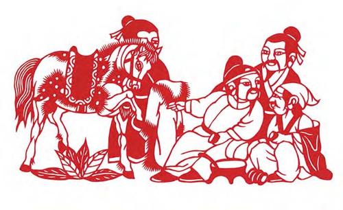 《回乡偶书》被非遗传承人范祚信制作成剪纸,画面结构并不复杂,一棵树、三四个顽童,还有一位归家的游子,略显难为情的背对众人。不仅每人表情略有不同,衣服上的褶皱也极为纤细精致,勾勒出一幅“回乡”图景。