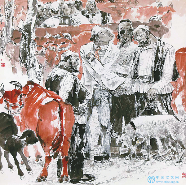 作家张贤亮在评价张少山的画作时,曾开门见山地说,“每读少山的画作,他对线条的特殊处理,都给我很深的感受”,真是一语破的,张少山的作品给人印象最深的就是线的无处不在,本来中国画的最主要特征就是“以写为法”“以骨为质”。张少山紧紧抓住了中国画以线造型、笔墨传情的精神实质和核心内容,将线由单纯描写物象的形态,升华为同时表达不同情感内容的线意,因此在不同内涵的作品中便产生了不同的线描。试看《揣手》中表现敦厚老人用的稚拙刚劲的线、《白色盖头》中刻画慈祥老妇用的圆润柔和的线、《唐人赏鱼》写美女用的行云流水的线、《信天游》中表现放羊娃子无拘无束用的线,笔断意不断的线,还有貌似不经意的线、简之又简的线、繁而又繁的线,以及线与色交融或与墨穿插等多种手法,不同的线意对画面旋律和结构产生了不同的作用,张少山理解和掌握了“中国画就是一个线的艺术天地”的形式规律,因此将线演绎到出神入化、不期而然的境界。在线意丰富变化的基础上,张少山落墨中肯大气、笔法灵动洒脱、少许点缀颜色、强调黑白效果,暗合了中国传统绘画倡导的“五色缤纷、不易古雅”的审美之道,符合中国人几千年来形成的审美习惯。