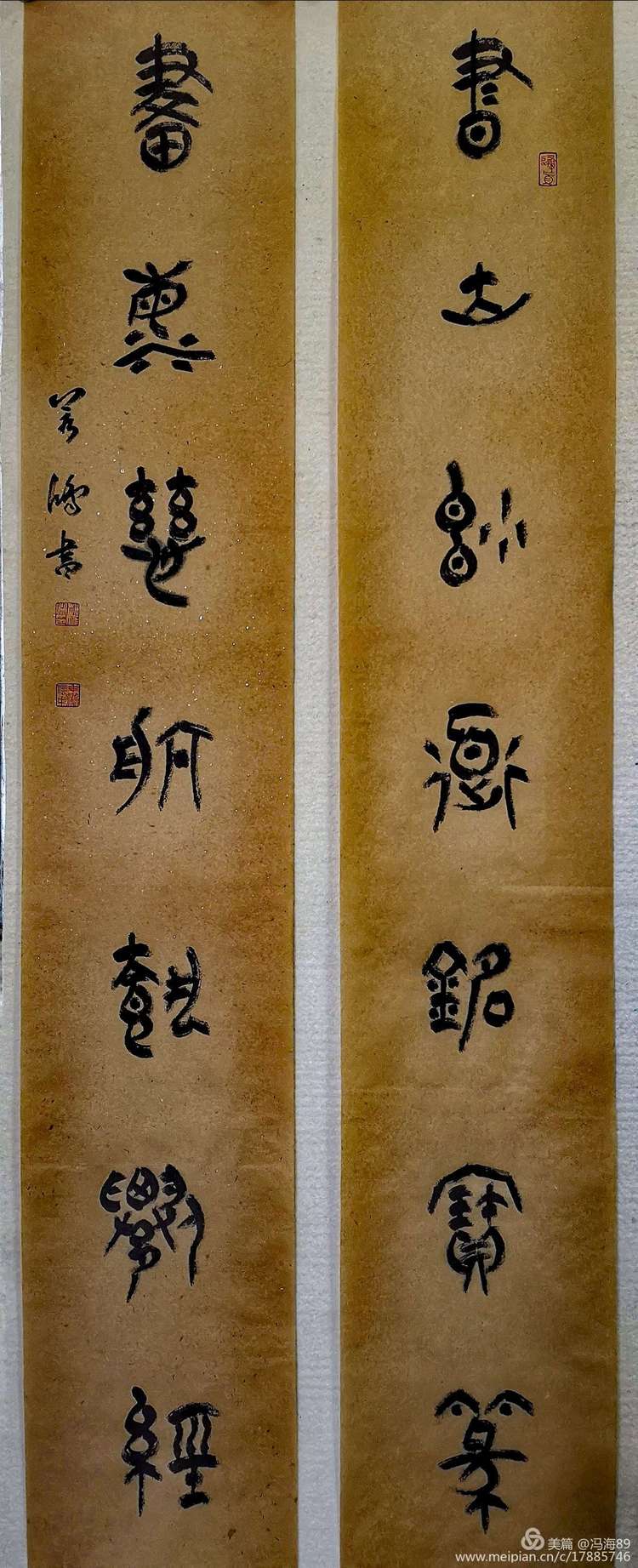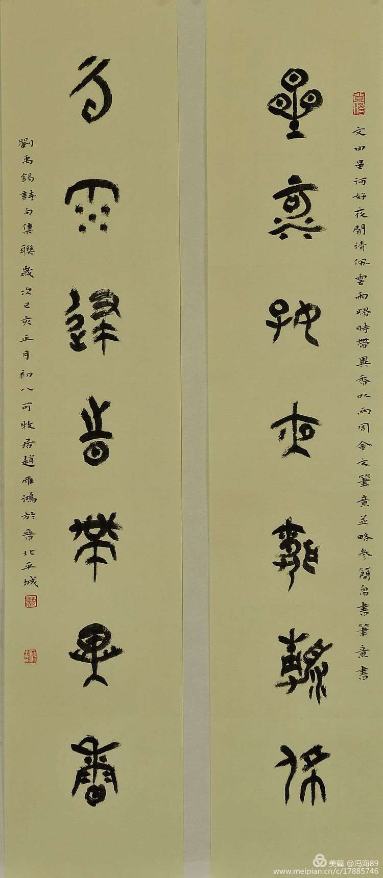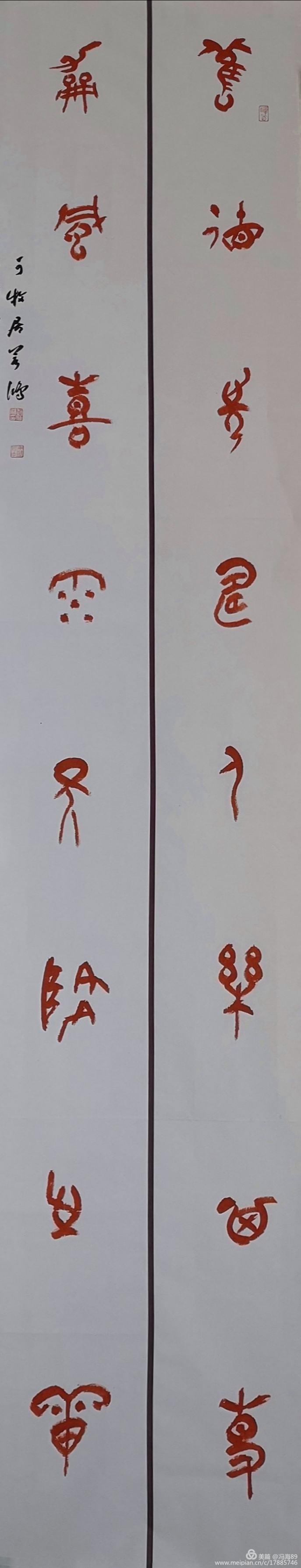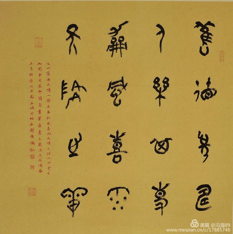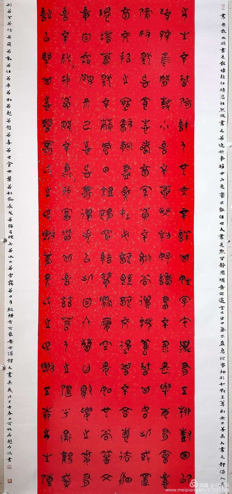 在清篆风靡书坛的当下,与两千多年前的古人相遇,字貌表现都要受其检阅,即便是终日对照摩写也不见得攫其要领。在雁鸿看来,古人的影像,是“形”聚凝于二维,“神”幽渺于高维,今人以古人的影子来进行再创造,物象是次要的,“笔墨神韵”才是审美终极。所以今人习练书法,当是表现而非再现,当是神会而非拜会,是人作为主体意识对物象灵魂的心灵确认。诚如雁鸿老师王友谊先生所评价的那样:“赵雁鸿的篆书,是很有现代意味的--以古出新,一方面又是新趣叠出……他积学崇古,笔挟元气,韵余于笔,字里行间既有《散氏盘》力透纸背的峥峥之音,又不乏《石鼓》婉转浑穆的庙堂气象”。“他行笔轻盈而不乏碑版之厚重,结字高远而得商周之神韵。墨气淋漓处显磅礴恢弘,牵丝凝练处透轩然正气,处处给人以优游恰适、潇洒超迈的审美感受。”
