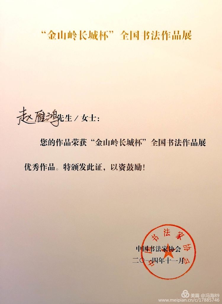 2014年,中国书协举办了一个专业大展,雁鸿的一副六尺对联成功入选并获奖,成为大同市建市以来获得中国书协专业展览大奖的第一人。2015年9月15日,国家博物馆收藏了当代十位书家的作品,并举行盛大仪式,前馆长吕章申代表国家博物馆为十位书法家颁发收藏证书,这其中,就有雁鸿的作品并且是唯一的一件大篆类作品入藏。众所周知,在此之前,国家博物馆只收藏1949年以前的并且是重大题材的作品,馆藏当代健在书法家的书法作品还是第一次。这件作品融甲骨、金文、简帛书等多种元素于一体,既拙朴浑厚、深沉苍劲,有古质之风;又清丽温婉、骨秀神清,具雅意之貌。可谓爽健之中寓苍厚,浑融之间透清朗。至此,雁鸿的书法作品和书法地位,有了一个完美的归宿,永久陈列于中华博物馆级的最高殿堂,进入中华艺术长河,载入中华历史的史册!