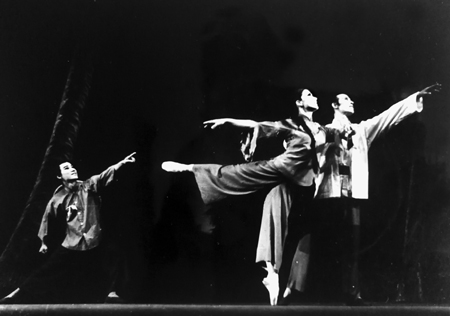 革命现代芭蕾舞剧《红色娘子军》第一版剧照,图为第一场“常青指路”三人舞(蒋祖慧编导)。图片由蒋祖慧提供