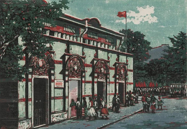 新中国成立初期诞生的美术经典中,有不少表现中国共产党成立这一“开天辟地的大事变”的佳作,如颜文樑油画《南湖》、沈柔坚版画《瞻仰》、陈逸飞与邱瑞敏合作的油画《在党的一大会议上》等,以不同风格、不同视角展现了深刻而丰富的精神内涵。这一时期的党史题材油画名作有罗工柳的《地道战》、王式廓的《参军》、董希文的《开国大典》、艾中信的《红军过雪山》、靳尚谊的《毛泽东在十二月会议上》、钟涵的《延河边上》等;中国画名作有王盛烈的《八女投江》、石鲁的《转战陕北》、叶浅予的《北平解放》、李琦的《主席走遍全国》等。这些作品都以对历史场景和人物形象的具体描绘,展现了中国共产党人艰苦卓绝的奋斗历程和崇高的精神境界。雕塑名作人民英雄纪念碑浮雕、潘鹤的《艰苦岁月》等,同样展现了大无畏的革命英雄主义精神。除此之外,黄胄中国画《洪荒风雪》、潘世勋油画《我们走在大路上》等经典作品,小中见大,生动再现了中国共产党团结带领人民艰苦创业的精神风貌。