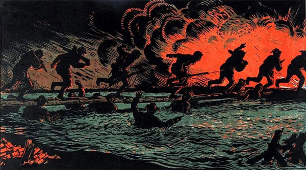 早在延安时期,木刻艺术家们便用手中的刻刀,表现党领导下的人民军队始终与人民群众勠力同心、并肩战斗的情景。胡一川的《到前线去》、力群的《饮》、彦涵的《当敌人搜山的时候》、古元的《人桥》等经典名作,以单纯而有力的木刻艺术语言,成就了对于峥嵘岁月的视觉记录与诗意表现,展现了家国危难之时艺术创作的重要作用。