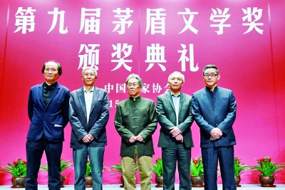 第九届茅盾文学奖获奖作家合影,从左到右依次为金宇澄、李佩甫、王蒙、格非、苏童。王继国摄/光明图片