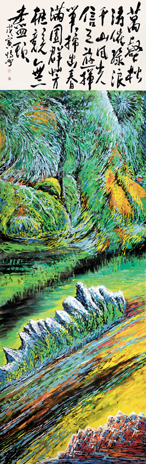 初观孙博文的“彩墨山水”,点线面综合交织,彩墨挥洒有致的画面中氤氲一股“和合”之气让画面庞而不杂、密而不繁;熔中西古今视觉元素于一炉,中学为体,以西润中。这是孙博文在解构传统与建构当下另种力量对抗间寻找平衡点,是他晚年思维深处对传统文化当代意识转换的艺术再现。