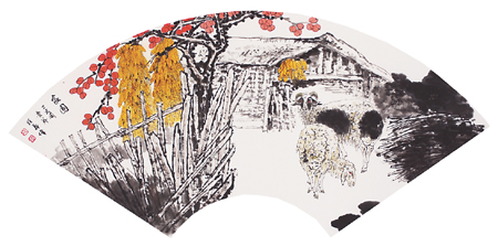 如果说哈德逊河画派是充分写实的笔触浓重、色彩浓郁的西方油画,程义伟的扇面画则是追求神似而不力达形似的中国水墨画,它所传达的是中国传统的审美意识和情趣。欣赏哈德逊河画派的大幅油画,我们可以身临其境般地投入身心,与之汇融,进入审美境界;观赏程义伟的写意小品扇面画,则是咫尺眺乡野,方寸蕴襟怀。画家把树林、小溪和草木以及小鸟、昆虫、牛羊组合、安置在一种温馨的乡野、荒原的环境之中,将其形象或具象或象征地表现出来,而欣赏者则可以凭此去主观感受和联想、创获,从中思索并顿悟。