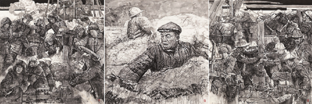 历史题材创作想要创新并非易事,因为历史事件是大家都十分熟悉的,将画面画得太抽象会缺乏共鸣,关键是要将形象画到位。纵观《激情燃烧的岁月》,既有扎实的写实造型能力,又清晰可见笔性墨韵的淋漓挥洒,强烈的黑白灰构成对比下的形式美感在这幅历史题材创作中达到了理想呈现。