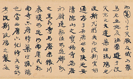 行草《开封琉璃塔记》,纸本,横157厘米纵18厘米,凡57行,700余字。琉璃塔又称开宝寺塔,为汴京著名八景之一。66岁,正是人书俱老,艺术上炉火纯青之时。康氏此年的纪年作品盖有40余件,不仅数量大、范围广,而且多为壮游纪行之作,兴酣意浓,笔精墨妙,颇多巨制力作。