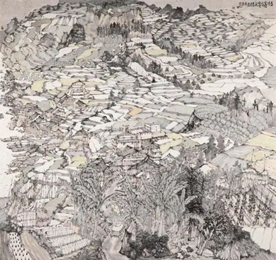 五谷瓜果栽满沟,梯田层层披绿装。在提升耕地质量的同时,人们更加注重对生态环境的保护。像徐里的油画《加榜梯田》、韩昌力的中国画《绿水青山之叠田》、田云龙的版画《印象皖南·雨后》等作品,均以生态优美的梯田为表现对象,诠释人与自然和谐相处的智慧。山水与耕地的奇妙交融,在丹青华彩的渲染下更显瑰丽壮阔,大地生态画卷的最美底色——绿色,愈发鲜明。