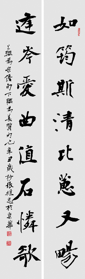 如何把北碑中的魏楷变成现代的魏楷,孙伯翔的探索还将北碑的沧桑漫漶与文人的淡泊典雅结合起来,使其魏楷清新有趣,显示出从未见过的书卷之气;李啸的贡献是将变化不定的北碑楷式进行整理规范,呈现和创造出符合现代人审美的辨识分明的体例;而张维忠则是在北碑原有的基础上强化其书写性,让金石刀刻还原于最初的笔墨书写,赋予魏楷更多的灵性。张维忠虽然在书写中受到《圣教序》《书谱》等帖学经典的影响,但还不能将其看作是完整意义的碑帖结合,而是在展览机制发生变化的情况下,对北碑魏楷的现代性改造,因为其基本面貌始终还是魏楷。他强调:“在魏楷书写的过程中,注重法度和速度的同时,还要辩证借鉴其他书体的结字、用笔和意趣。”其创作“由碑入帖,又以帖融碑,碑帖相渗,自然生发。”这些是张维忠对传统魏楷进行改造的秘诀。被张维忠增加了书写性的魏楷,似乎换了一种表情,看上去更加清朗雅逸,富有节奏音韵之感,无论是厚实还是纤秀,都写得轻松、自然,平添了许多个人性情与笔墨的抒情成分,还智慧地把握住了楷与草的分寸,避免了一种超越法度的任性与不伦不类。这反映出张维忠对北碑魏楷书法的不同理解和思考。著名书法家张旭光说张维忠“以魏碑为基,揉入行草笔意,形成了空灵淡雅的魏楷书风。”著名作家、书画家韩静霆将张维忠的书法特色概括为“雨打芭蕉、平沙落雁、一苇渡江、越女新妆。”四句话,四个典故,我理解是有境界、有诗情、有新意、有生趣等。2007年,中国书协原副主席旭宇先生提出的“今楷”理念,曾一度为书坛注目,他认为张维忠这种以魏碑为主的楷书具有时代特点,有“今楷”的意味。李铎、孙伯翔等书法家对张维忠的探索都给予了充分肯定和高度评价。