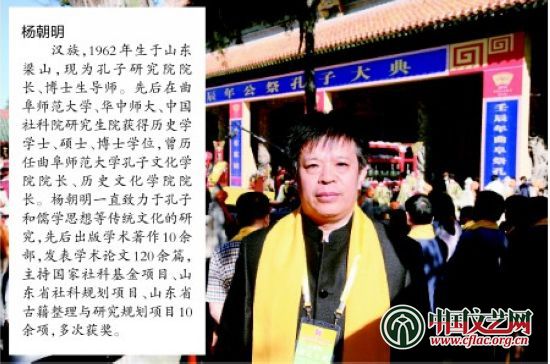 汉族,1962年生于山东梁山,现为孔子研究院院长、博士生导师。先后在曲阜师范大学、华中师大、中国社科院研究生院获得历史学学士、硕士、博士学位,曾历任曲阜师范大学孔子文化学院院长、历史文化学院院长。杨朝明一直致力于孔子和儒学思想等传统文化的研究,先后出版学术著作10余部,发表学术论文120余篇,主持国家社科基金项目、山东省社科规划项目、山东省古籍整理与研究规划项目10余项,多次获奖。